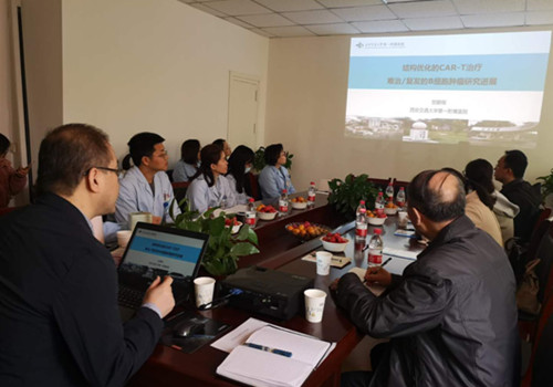 活動安排有專題講座、病例討論、查房。學術講座在血液內分泌科示教室進行,賀鵬程主任進行了題為《結構優化的CAR-T治療難治/復發的B細胞腫瘤研究進展》的講座,深入淺出介紹了目前國際上最先進的改良CAR-T試驗室及臨床研究情況;王芳主任就其中熱點和疑問之處與賀主任進行了討論。病例討論環節氣氛熱烈,血液內分泌科多位醫生就臨床實踐當中遇到的疑惑和問題向賀主任進行了請教,賀主任均給予了細致的講解,大家收獲很大。隨后賀主任參觀了血液病實驗室,對實驗室目前的工作進行了肯定,并建議可以進一步開展PCR、染色體、血小板抗體等項目檢測。賀主任查看了一位定期化療的多發性骨髓瘤患者,就其下一步診治方案給出了中肯的意見。查房中,賀主任對我院給予患者提供的周到細致的服務給予了贊許。