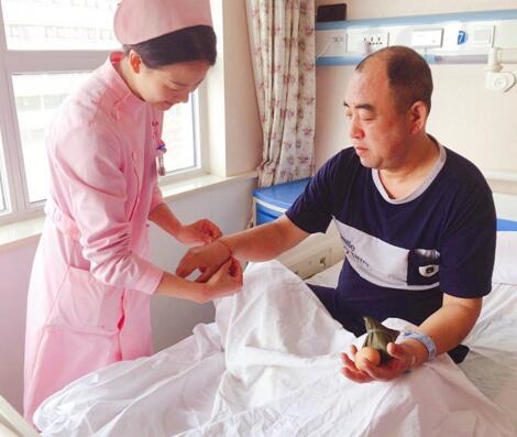 護(hù)士長杜愛榮帶領(lǐng)護(hù)士們,親自給所有患者佩帶上,我國傳統(tǒng)意義能辟邪、帶來好運的五彩花繩。有患者喃喃自語:“這花花繩意義非凡,到時候我也舍不得取下來咋辦……”還有患者感嘆道:你們醫(yī)院真好,端午節(jié)還給我們發(fā)粽子雞蛋,還給病人帶花繩......只有小時候媽媽才給我們帶過花繩繩呢!