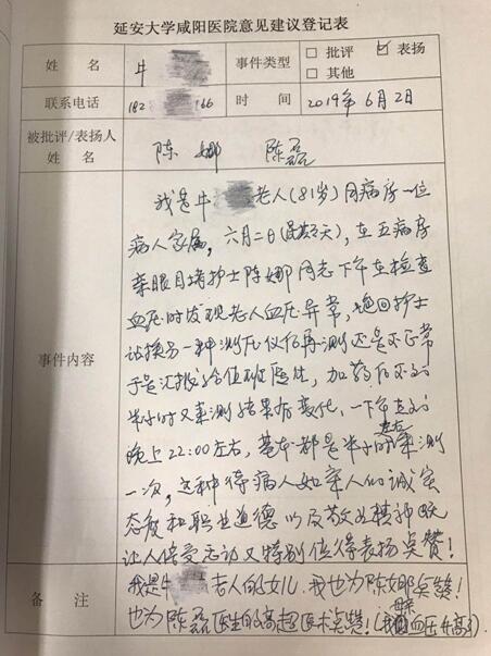 就這樣,我每半小時跑一趟,認認真真的測量雙上肢血壓,每次有一點點改善,我都會安慰患者說,奶奶,你的血壓現在慢慢上來了,有什么不舒服的及時按呼叫器,我也會多來看您的,別緊張,藥用上了馬上就正常了……也就是工作中的日常用語,居然讓鄰床的患者家屬感動不已:這么負責的護士我必須得給你點贊。老奶奶的女兒也跟著說,她母親血壓一直比較低,看到我這么上心,她也很感動……于是就有了下面一封表揚信。