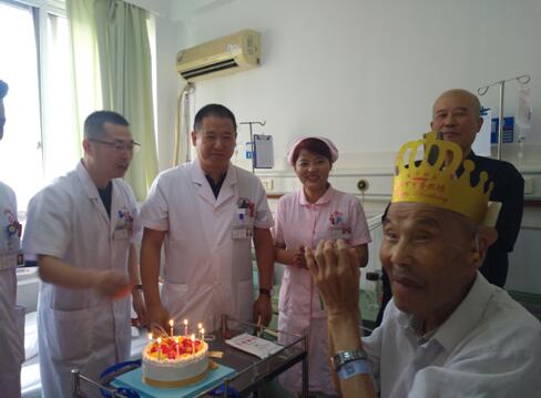 2019年8月22日上午,放療科的病房里其樂融融?!白D闵湛鞓罚∽D闵湛鞓贰?伴隨著歡快的歌聲,尹信主任帶領科室人員端著生日蛋糕來到趙大爺床前?!按鬆敚D湛鞓罚郾饶仙?!早日健康!”。 老人愣了一下,繼而開心不已,笑的像個孩子:“來醫院看個病,還給過生日……嘿嘿……”
