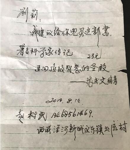 趙大爺退休之前是一名優秀的教師。住院期間,在和護士長溝通交流的過程中,得知護士長的孩子在上高中,便記在了心里,一天早上查房時,他鄭重其事地將一張推薦購買優秀書籍的紙條遞到護士長的手里,自己病魔纏身,還替別人操這份心,護士長劉莉很感動。