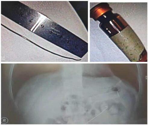 在李恒副主任醫師及內鏡中心醫護人員的緊密配合下,內鏡進鏡至胃底,可見一藥瓶潴留于粘液湖中,因瓶身極為光滑,周圍粘液附著,鉗取難度較大,遂以圈套器套至瓶頸部,緩慢退鏡,隨胃鏡取出,藥瓶完整無破碎,長度約5cm。再次進鏡至十二指腸降部,可見一鋼絲樣異物嵌頓入腸壁,周圍已形成潰瘍,隨時有穿孔的風險。因鋼絲細、尖、長、硬,為避免二次損傷,操作過程中不斷調整異物鉗角度,變換方向,松動后緩慢退鏡,隨胃鏡取出,鋼絲長約13cm。整個過程不到30分鐘完成。后經隨訪,患者生命體征平穩,已開始進流食。這是我科又一例成功內鏡下異物取出術,也是首例小腸異物取出術。