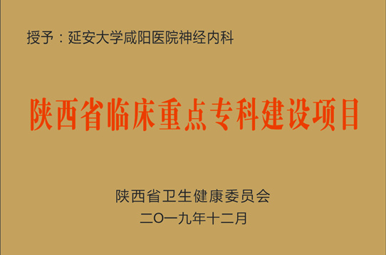 延安大學咸陽醫(yī)院神經(jīng)內科是咸陽市重點學科、咸陽市神經(jīng)內科質量控制中心依托單位、咸陽市11個科技創(chuàng)新團隊依托單位、咸陽市轉化醫(yī)學工程技術研究中心依托單位、神經(jīng)內科專業(yè)國家藥物臨床試驗機構等;2017國家衛(wèi)計委腦防委和陜西衛(wèi)計委聯(lián)合授予“國家高級卒中中心”,2018年中國卒中學會與中國卒中中心聯(lián)盟聯(lián)合授予“綜合卒中中心”,是咸陽市“咸陽卒中聯(lián)盟理事長單位”,是“咸陽市卒中學會會長單位”,是咸陽市醫(yī)學會神經(jīng)內科專業(yè)委員會主任委員單位。