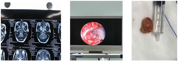 患者,女性,56歲,因右側(cè)面部麻木不適入住我院神經(jīng)內(nèi)科,經(jīng)檢查頭顱核磁共振發(fā)現(xiàn)翼腭窩腫瘤,轉(zhuǎn)入我科后,張主任即安排病例討論,經(jīng)進(jìn)一步完善術(shù)前檢查,多考慮神經(jīng)源腫瘤,但不排除血管類腫瘤及惡性腫瘤可能,為降低手術(shù)中可能大出血風(fēng)險(xiǎn)、腫瘤惡性可能,術(shù)前備血、準(zhǔn)備術(shù)中冰凍,并請(qǐng)?zhí)弁纯茣?huì)診行責(zé)任血管上頜動(dòng)脈介入栓塞治療。將各種意外情況出現(xiàn)的可能性綜合評(píng)估后,一切準(zhǔn)備就緒,在全麻下行經(jīng)鼻竇內(nèi)窺鏡翼腭窩腫瘤摘除術(shù)。術(shù)中未出現(xiàn)大出血,腫瘤邊界清,考慮良性腫瘤,仔細(xì)止血,碘仿紗條填塞鼻腔,手術(shù)歷時(shí)1小時(shí)30分鐘,順利完成。術(shù)后安全返回病房,未出現(xiàn)并發(fā)癥,病情平穩(wěn)。