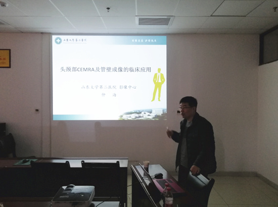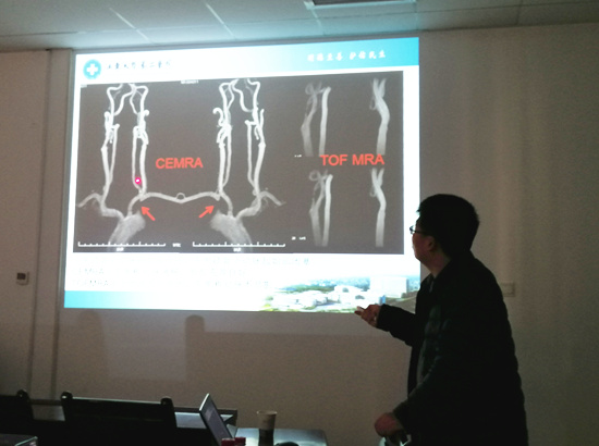 下午3點,授課開始,仲海教授分別從CEMRA與TOFMRA在血管壁成像上的優勢、血管斑塊成分分析及活動度判定、血管壁重塑基本概念及HRMR臨床應用和指導治療等方面入手,結合臨床及影像病例,展示隨訪科研數據,生動詳細的講解了CEMRA與TOFMRA在血管壁成像上的重要作用及豐富價值,讓我們學習到血管壁成像強化的重要性、對斑塊的精準分類判定的方法及影像報告需要提供哪些有效信息,同時他還指出,CEMRA顯示血管狹窄情況能與DSA一致,對管腔信息、斑塊形態、活動度鑒別等能夠為臨床提供客觀數據,為臨床預后,跟蹤與針對治療能提供極大幫助。課后,我科張媛、張濤責任總醫師、蔣小鋒、蔡雷等二線醫師,張飛、馬旭陽等一線醫師、呂琳、陳浩、白江濤等技師分別就各自問題向仲海教授提問交流,學習氣氛濃厚,與會人員收益匪淺!