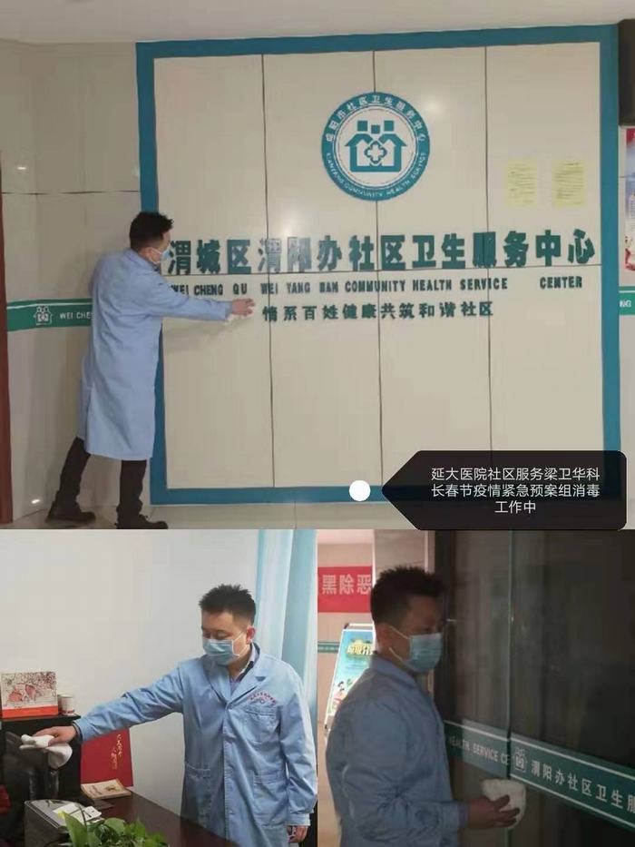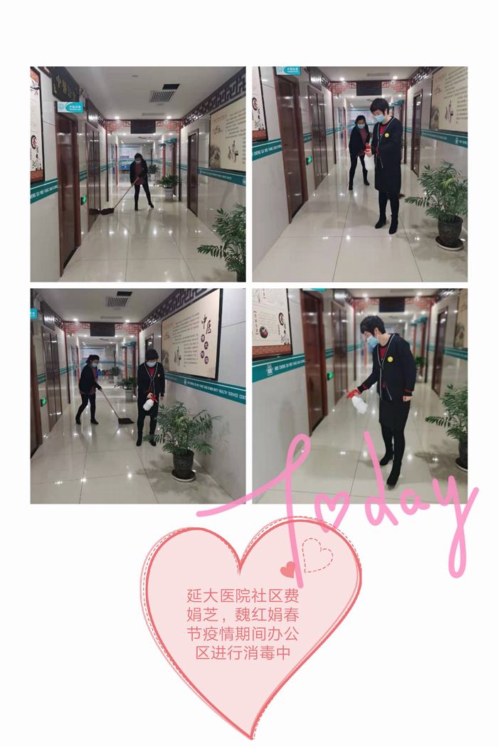 延大醫院社區費娟芝,魏紅娟春節疫情期間辦公區進行消毒中。