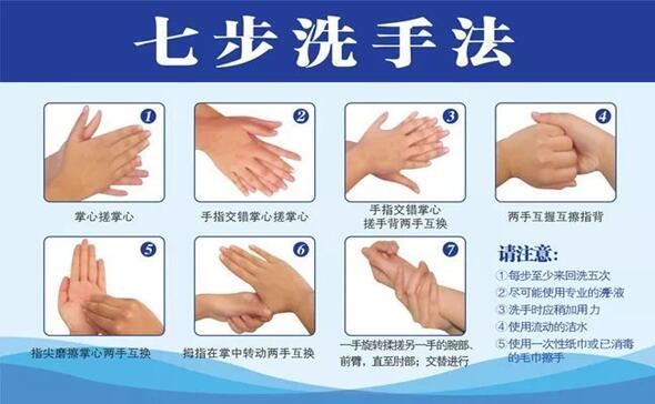 (4)勤洗手(七步洗手法),使用肥皂或洗手液流動(dòng)水洗手,用一次性紙巾或干凈毛巾擦干雙手。雙手接觸呼吸道分泌物后(如打噴嚏后)應(yīng)立即洗手。