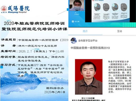 為了做好新型冠狀病毒感染的肺炎疫情防控工作,響應(yīng)國家政策減少聚集,同時不影響我院住院醫(yī)師規(guī)范化培訓(xùn)醫(yī)師(以下簡稱“住培醫(yī)師”)的培訓(xùn)管理和安全防護(hù)工作,在延安大學(xué)咸陽醫(yī)院腦血管病院慕廷民院長和神經(jīng)內(nèi)科住培辦教學(xué)主任郭愛紅的帶領(lǐng)下,腦血管病院于2月7日下午針對腦血管病院全體醫(yī)師和住培生約200余人進(jìn)行了網(wǎng)絡(luò)直播教學(xué)。