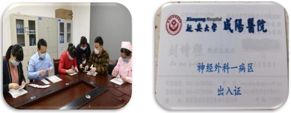 (3)為方便患者及家屬,在劉增強主任、趙茹護士長帶領下,科室人員利用下班時間制作了病區出入證,所有家屬憑出入證進出病區,并開啟門禁系統,減少閑雜人員出入。住院期間,根據患者情況留陪人數。疫情非常時期,為保證所有患者的安全和康復后更好的相聚,請做好親屬解釋工作,禁止探視。
