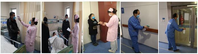 (4)如需住院,我們病區的防控工作按部就班進行:每天責任護士對陪護人員早晚測量體溫;向陪護人員講解正確洗手方法及防控安全知識;保潔員每天用消毒液噴灑病區,尤其是門把手、樓道護欄,做好消毒防控;患者及家屬出入均配口罩。