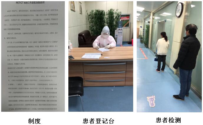 隨著新冠肺炎到來,為了避免院內交叉感染,追求醫務人員“零感染”的目標,根據醫院要求,PET/CT室制定相關防護工作流程及感染防控策略。全科在核醫學工作場所要求的三區(“控制區、監督區和非限制區”)劃分的基礎上,按照感控要求再次劃分“污染區、半污染區及清潔區”。進出各區時遵守相應的感控及核醫學工作場所相關要求。嚴格控制每日檢查人數;在科室門口設立體溫檢測點,細心為患者測體溫,用酒精為患者消毒并交代注意事項,登記患者信息及聯系方式;設置獨立問診室,問診醫生實行佩戴護目鏡、帽子、口罩等,實行單獨問診;護士因與患者近距離接觸,實行二級以上防護,穿防護服、戴醫用外科口罩、戴防護帽、護目鏡并穿鞋套。候診區患者實行一人一間病人,告知患者零交流;患者家屬檢查區以外等候,保持一定的距離。