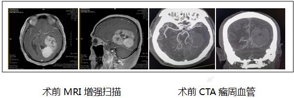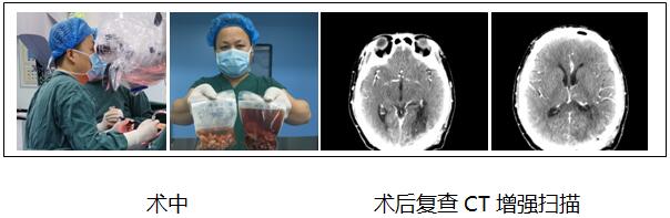 患者王某,男,49歲,因“頭痛伴視物模糊2月”入院,頭顱CT及核磁共振示左側腦室后角及枕葉巨大腫瘤。頭顱CTA及核磁共振增強掃描檢查發(fā)現(xiàn),腫瘤來源于腦內直竇和左側腦室脈絡膜,系不同來源質地不同的兩個腫瘤疊加連體生長而成。直竇為腦內深部最重要的大靜脈竇,脈絡膜為腦室內重要結構,腫瘤與以上結構聯(lián)結緊密,手術風險及難度都很大。考慮患者腫瘤巨大,周圍大血管密集,與重要結構粘連嚴重,劉主任組織團隊經過多次認真討論后制定了詳細的疾病診治方案,預先分析了手術中可能存在的風險及處理方案。與家屬反復溝通后。在劉增強主任、巨濤責任總醫(yī)師、李鑫醫(yī)師及手術麻醉科室的密切協(xié)作下,在全麻下實施顯微鏡下開顱腫瘤切除術。手術歷時15小時順利完成,成功切除全部腫瘤。術后一切正常,經重癥醫(yī)學科和神經外科一病區(qū)護理單元精心護理,患者無新增神經功能缺損,原有視物模糊明顯好轉,康復出院。
