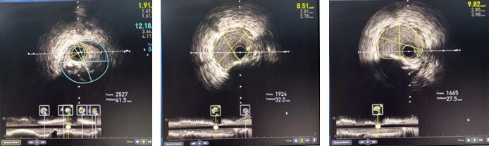 6月16日左梅主任再次采用了血管內超聲(IVUS)指導零造影劑支架植入。指引導管、指引導絲順利到位,通過IVUS導管送入LAD罪犯血管,測LAD最小管腔面積1.96mm2,斑塊負荷84%,遠端管腔直徑4mm,近端血管存在明顯的負性重構,管腔直徑約3.5mm,通過對開口到各分支距離的精確測量,選擇了3.5*38mm的支架植入,最終對病變部位進行了精準的完全覆蓋,復測IVUS看到支架內局部貼壁不良及膨脹不全,再次后擴張,IVUS最終檢測支架貼壁膨脹良好,最小管腔面積9.82mm2,成功對該患者實施了支架植入,解除冠脈狹窄,恢復了正常血流。