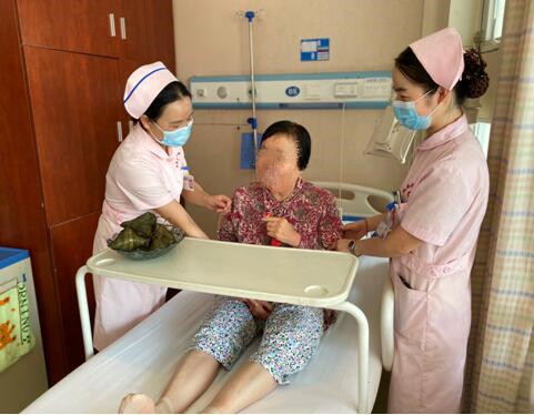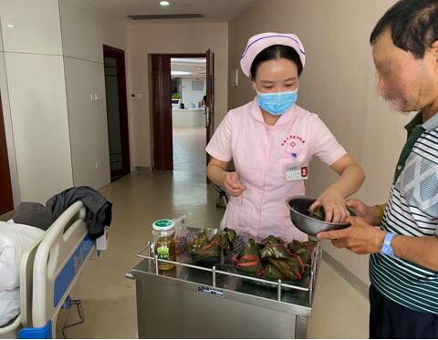 上午9點 ,護士長杜愛榮帶領(lǐng)護士推著送粽子車,為患者送上香甜的粽子,并傳達了科室人員對住院患者的關(guān)心。8床的魏阿姨拿到粽子后,開心的對醫(yī)護人員說,“感謝你們醫(yī)生和護士,技術(shù)精湛,服務(wù)溫馨,才有了我現(xiàn)在好的身體條件,一大早就收到了熱氣騰騰的粽子,感到非常溫暖,真是沒有想到住院還能享受到這么貼心的服務(wù),嘿嘿。”
