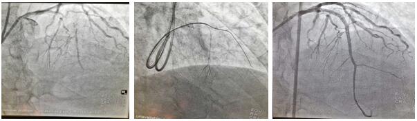 患者劉某某, 68歲男性,1月前于我院診斷:急性非ST段抬高型心肌梗死。行冠脈造影提示前降支近段100%閉塞,同側穿膈支側枝循環形成,回旋支近中段狹窄80%-90%,LAD為CTO病變,擬行完全血運重建治療,順利于回旋支病變處植入1枚支架,術中反復嘗試各種導絲均未能開通LAD血管,歷時近3小時,只能放棄,擇期再處理。面對困難,面對失敗,心血管二病區左梅主任醫師團隊,反復閱片,尋找失敗原因,知難而上,勇于挑戰,制訂新的手術策略,決定為患者第二次開通LAD閉塞病變。在經過充分的術前討論后于2020年7月2日第二次上臺,由于患者LAD近段CTO病變,前次正向途徑介入失敗,右冠無良好側枝形成,無逆向條件,擬行乒乓技術同側微導管造影顯示閉塞遠段,提供正向導絲的指引,進入遠端血管真腔;若失敗,微導管跟進至血管內膜下,采用ADR(正向內膜下重回真腔)技術完成手術。手術的重要點在于控制血腫的大小。術中采用同側雙指引導管至左冠脈開口(乒乓技術),在一側指引導管送微導管至穿膈支中段,超選擇造影清晰顯示LAD-CTO遠段,另一側指引導管內反復調試FieldXT-A導絲順利通過閉塞病變至遠段,在助手及導管室工作人員的全力配合下,歷時不到1小時,成功完成手術。術中患者無任何不適及并發癥發生,一家人很是欣喜。