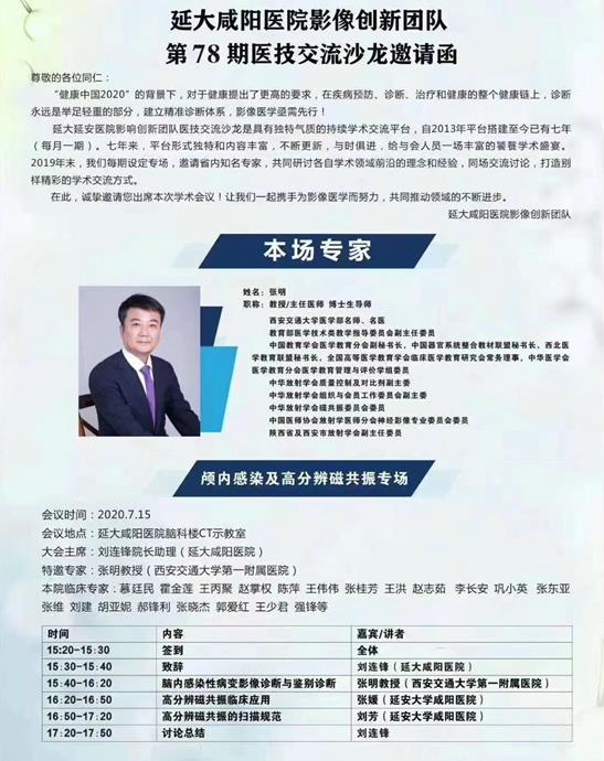2020年7月15日,醫學影像科在腦血管病院CT室示教室舉辦第78期“醫技交流沙龍”活動,本次邀請到的專家是西安交通大學第一附屬醫院張明教授。