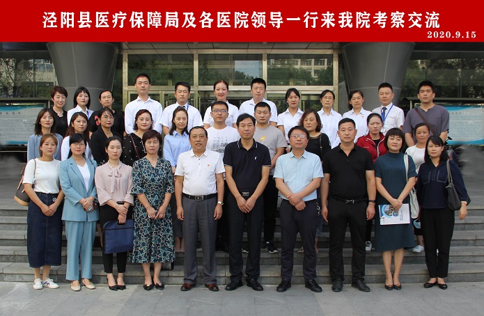 2020年9月15日,涇陽縣醫療保障局副局長楊宏勛及涇陽縣各級醫院領導一行20人蒞臨我院考察交流。延安大學咸陽醫院董事長李衛軍、院長助理沙寧、副總會計師高霽及相關職能部門、臨床科室負責人陪同接待。