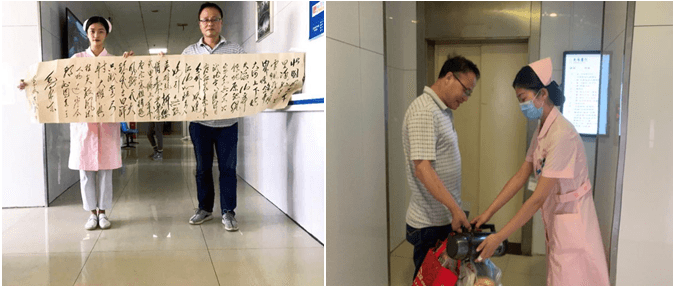 當我們不能預測患者想要什么,就無法在患者沮喪、痛苦和悲傷時表示同情,也無法進行靈魂與靈魂的交流,每個生命都是獨特的,我們需要帶著尊重、謙卑、好奇的心態,陪伴每一個人去探索生命的神秘之處,以情說話、帶情傾聽、用情照護,用愛陪伴。當我們面對患者時就像面對自己的家人一般,當患者孤獨無助時,握住患者的手,做個有溫度的護士,給患者溫暖、光明、力量。在接下來的住院期間,李叔叔每次見到我都會親切的叫到小孫你上班啦!做為一名新入職護士,我感受到了李叔叔的真誠,也體會到只要我們做出了值得患者尊重的事情,就會贏得患者和家屬更多的理解和尊重。李叔叔對中醫科全體護士給予高度贊揚,他談到在這里住院有了不一樣的感受,雖然在醫院卻有了在家的感覺,感受到了如同家人般的溫暖,出院時擅長書法的李叔叔送了我們一幅親筆字畫,其實我們只是做了我們應該的工作,卻贏得了李叔叔如此的信賴,這不僅是對我們工作的認可與肯定,更是一種鞭策。