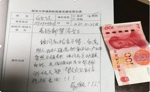2020年10月20日,延安大學咸陽醫院心血管病院收費員都夢潔在收費室窗口撿到一個錢包。于是拿回科室上報保存,為了快速找到失主,她打開錢包,里面有(身份證、銀行卡、駕駛證、少許現金),通過各種途徑查詢此失主在醫院曾留下的電話號碼,第一時間聯系到失主,失主在電話里激動地說他找了好久,并約好21日來取。第二天,失主來后經收費員認真核對身份,確認無誤后將物品歸還失主。此時,失主激動地緊緊握住工作人員的手并連連道謝,且為收費員留下感謝信。為了表示感謝,還在感謝信里夾了100元現金以表謝意。收費員連忙揮手說,不要不要,這是她們應該做的。看到收費員再三拒絕,失主轉身邊揮手邊說:“拿著,拿著,面帶微笑并離開。”但由于當時窗口患者排隊較多,為了不影響其他患者掛號繳費,收費員未能及時起身歸還。(現金已上交醫院廉政賬戶)
