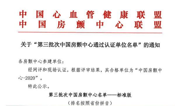 我院于2019年02月,由心血管病院吳棟梁院長牽頭,心血管內科為主體,醫務部、門急診辦公室、醫院辦公室提供支持,急診科、心胸外科、腦血管病院、內分泌科、普外科、放射科、超聲醫學科等多科室協作,正式啟動房顫中心建設工作。2020年5月獲第三批房顫中心建設單位。2020年10月28日獲得中國房顫中心標準版認證。