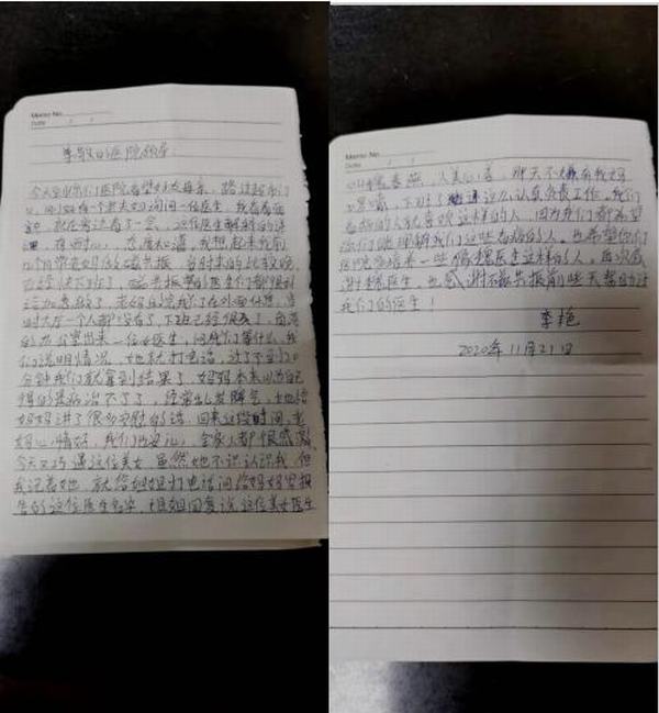 2020年11月21日,一封真誠質樸的感謝信驅散了冬天的寒冷,帶著暖陽般的溫暖送到了CT/MRI室工作人員的手中,信中內容概括如下:李艷女士在我院探望親友之時,路過超市門口時聽到了一位醫生正在向一對老夫婦耐心解釋問題,面對此情此景她回想起了她帶母親來我院就診時的情景,在她們做完檢查在下班后空無一人的待診大廳中焦急等待時,同樣是這位醫生看到了她們,主動上前詢問并幫助她們盡快拿到了就診結果,并耐心勸慰她和母親,使得她母親的心情放松愉快起來。對此,李艷女士經過打聽詢問后知道了這位醫生的名字,她就是延安大學咸陽醫院CT/MRI室責任總醫師魏春燕同志。在我科室接到信件向魏醫生詢問時,魏醫生謙虛地說道:“其實我們科室很多人都是這樣做的,只是我可能被患者和家屬注意到了,能收到這封信真的很感動,要向她們表示我真誠的謝意”。