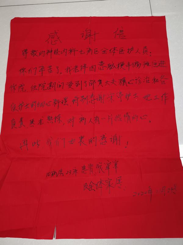 近日,在我科室住院治療多次的老病患為科室送來了一份溫暖又特別的感謝信,信中提到我科醫(yī)護人員對待病人像親人一樣,說話和氣,行動暖心,著重提出科室李長安主任及邵賀主治醫(yī)師、葛明娟主治醫(yī)師對待病人的熱心、負責,醫(yī)術(shù)更是精益求精。還有在護士長的帶領(lǐng)下護士田攀、宋亭及全體醫(yī)護人員對待病人和藹可親、細心呵護。短短幾句話,滿是患者在多次住院治療期間的感謝和感動。自活動開展以來,一面面熠熠生輝的錦旗,一封封飽含深情的感謝信,是患者對醫(yī)護人員仁心仁術(shù)的最大肯定,錦旗和感謝信承載著患者對醫(yī)院的信任和感激,象征著醫(yī)患情深,收獲的不僅僅是一份榮譽,更是一份期望、一份鞭策、一份信任,科室將以此為動力,更加努力地為每位患者提供更加優(yōu)質(zhì)的服務(wù)。