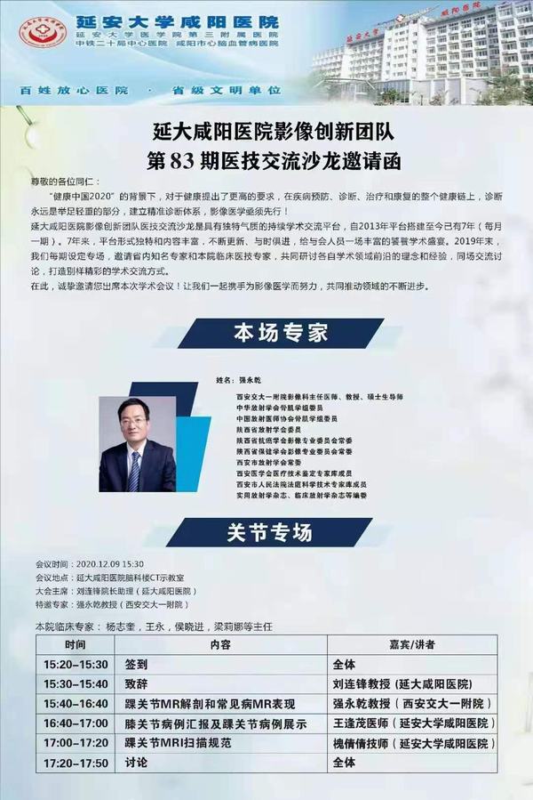 2020年12月9日,延安大學咸陽醫院第83期醫技交流活動在腦科樓CT/MRI示教室成功舉辦,延安大學咸陽醫院院長助理兼醫學影像科主任劉連鋒教授主持,特邀西安交大一附院強永乾教授及我院骨一科楊志奎主任、骨二科侯曉進主任、急診科宋治國主任、超聲科吳建軍主任及215醫院張華文主任團隊等臨床醫師參加本次活動。我院影像及臨床醫、技、護共60余人參加了本次會議。