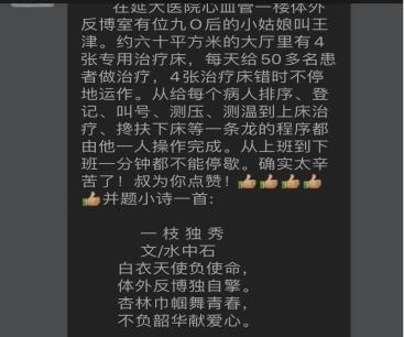 2020年,我院全面推廣“服務品牌建設年活動”,為患者創(chuàng)造不一樣的就醫(yī)體驗,各科室也在積極響應。我科努力遵循“以患者為中心,以真誠換理解,以微笑博好評,以服務贏聲譽”的服務理念。在工作期間,我們收到過形形色色的感謝信和錦旗。前不久我們收治了一位大叔,他是一位老教師,在他的體外反搏治療結束后說道,通過這幾天的相處,他看得見我們的辛苦,同時也感受到我們超棒的服務態(tài)度,對住院期間的一切都滿意,并在治療結束后,即興為護士作一首小詩表示感謝。就是這樣一首蒼勁有力的小詩,帶著自己無限的感激之情,感動了我們所有人…“在延大醫(yī)院心血管一樓體外反博室有位90后的小姑娘叫王津。約六十平方米的大廳里有4張專用治療床,每天給50多名患者做治療,4張治療床錯時不停地運作。從給每個病人排序、登記、叫號、測壓、測溫到上床治療、攙扶下床等一條龍的程序都由他一人操作完成。從上班到下班一分鐘都不能停歇。確實太辛苦了!叔為你點贊!并提小詩一首。