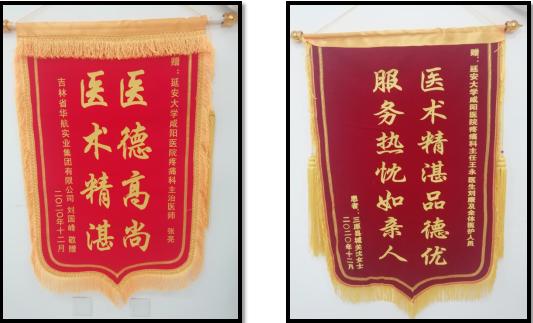 一句問候暖心,一聲謝謝訴衷情。精湛的技術將患者疼痛消彌,貼心的服務將患者暖心。患者王大爺,帶狀皰疹后遺神經痛,加之年事已高,疼痛劇烈且時間長,輾轉多地就診,未見明顯效果,一度有輕生念頭;慕名來我院后,積極完善相關檢查,制定治療方案,特別是對患者進行的心理疏導,灌輸積極向上的思想,讓患者打消輕生念頭。第一次治療結束后,由于麻藥的作用患者不能行走,急壞老伴。劉醫生直接將病人抱回病床上,老伴連連稱謝,說:“兒子都沒抱過老伴,太謝謝你了,劉醫生。”經過細心治療,患者痊愈出院,家屬專程制作錦旗表達感謝。