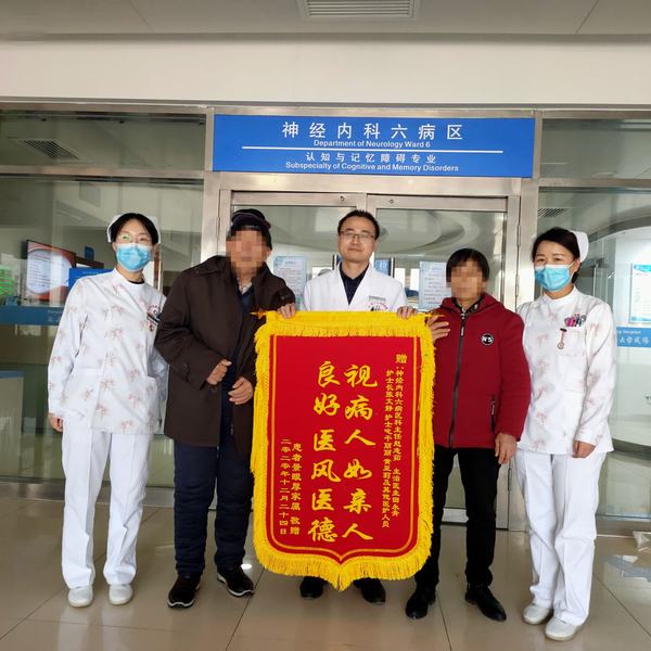 今天下午,我們就收到了來自患者及家屬的一面錦旗,對科室醫(yī)護人員高尚的醫(yī)德,周到的服務表達了誠摯謝意。據了解,患者是位男士,68歲,癡呆,住院期間,兒女忙于工作無法照料,照顧病人的重擔就落到了患者老伴的身上,護士長張文靜了解情況后,根據科室的專科特點,為防止患者走失,特意為患者精心制作了一張防走失掛牌。當防走失牌掛在大爺的身上時,阿姨直夸我們想的太周到了!并直言要把它帶回去,這樣回家后也就不怕走丟了!有時大爺無法控制情緒,鬧著不愿打針時,責任護士叱干麗麗就會蹲在大爺的身旁像他閨女一樣的耐心勸說,直到患者情緒穩(wěn)定,配合治療。這一件件,一幕幕,都讓阿姨對我們頻頻稱贊!護士長還特別強調一定要加強對患者家屬的健康教育和心理疏導,竭力協(xié)助他們在住院期間的疾病治療和患者照護中的諸多實際困難。我們的一句句叮嚀,一聲聲問候,使患者及家屬在住院期間,感受到了醫(yī)護人員最溫暖的關愛!