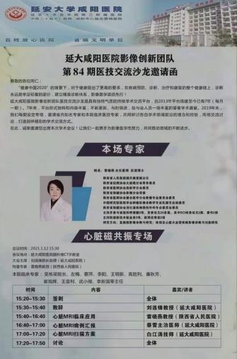 2021年1月12日,在嚴格做好防疫要求的情況下,延安大學咸陽醫院第84期醫技護人員交流活動在腦科樓CT/MRI示教室成功舉辦,延安大學咸陽醫院院長助理兼醫學影像科主任劉連鋒教授主持,特邀陜西省人民醫院雷曉燕教授、咸陽市中心醫院白云主任及我院吳棟梁院長、心血管病院各病區主任、骨干、超聲科王英莉主任、心電圖室王芝榮主任等臨床與影像醫、技、護參加了本次會議。
