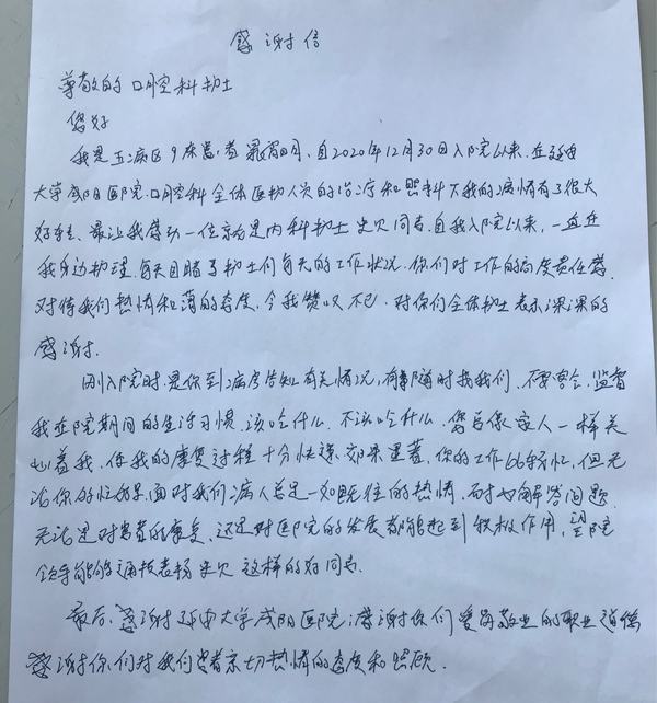 隨著疫情的反復,加上南下的寒潮,今年的冬天仿佛變得格外寒冷,口腔科護士史貝收到了一封患者的感謝信,內心無比溫暖,事情要從2020年年末說起。
