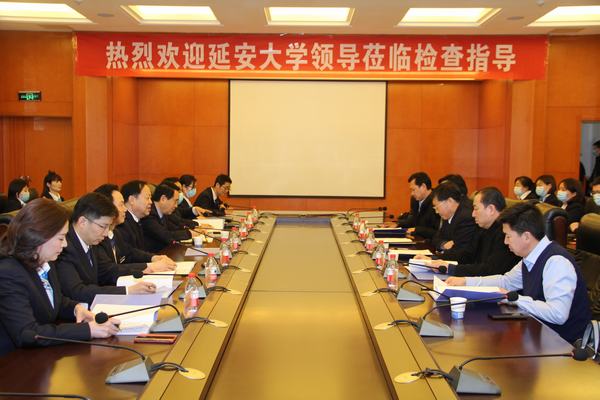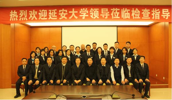 2021年1月25日下午,延安大學黨委書記張金鎖、校長高子偉,醫學院院長韓繼明、黨政辦主任李楊、教務處副處長兼醫學院教學辦主任高楓等一行五人來我院檢查指導工作。精誠醫療集團董事局主席張群、秘書長吳學讓、延安大學咸陽醫院院長張海濤、常務副院長姚曉峰、科研教學管理中心主任韓曉芳、副院長王丙聚等領導陪同參觀并出席座談會。