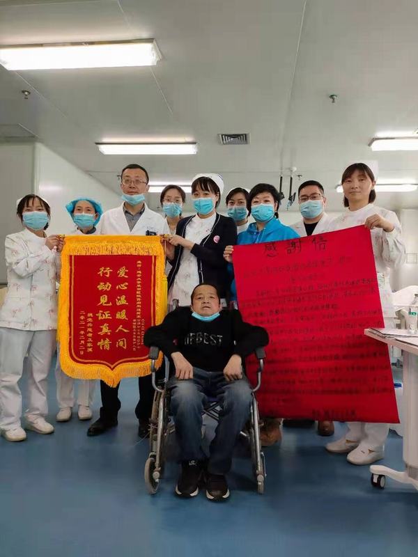 面對這樣的情況,我們看在眼里,急在心里,雖然科室部分工作人員及患者朋友也自發地給他進行了捐款,可畢竟科室人員數量少,籌集的金額也有限,這時護士楊莎提議說,要不我們發揮社會的力量為他進行水滴籌吧!眾人拾柴火焰高,通過醫院領導、同事及科室人員的積極轉發,很快就為他籌得了幾萬元的 “救命錢”。“多虧你們了!真是非常感謝!”魏黨兵及年邁的父親激動的言語難以表達他們的感激之情,還特意為我們送來了錦旗及感謝信。