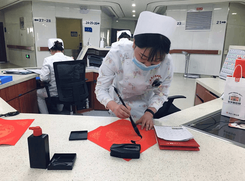 活動現(xiàn)場翰墨飄香、氣氛熱烈。骨科一病區(qū)護(hù)士馬瑞提筆揮毫潑墨,力求將最好的春聯(lián)書法作品送給患者及家屬一副副風(fēng)格迥異、字體多樣、墨寶飄香的對聯(lián)和“福”字躍然紙上。