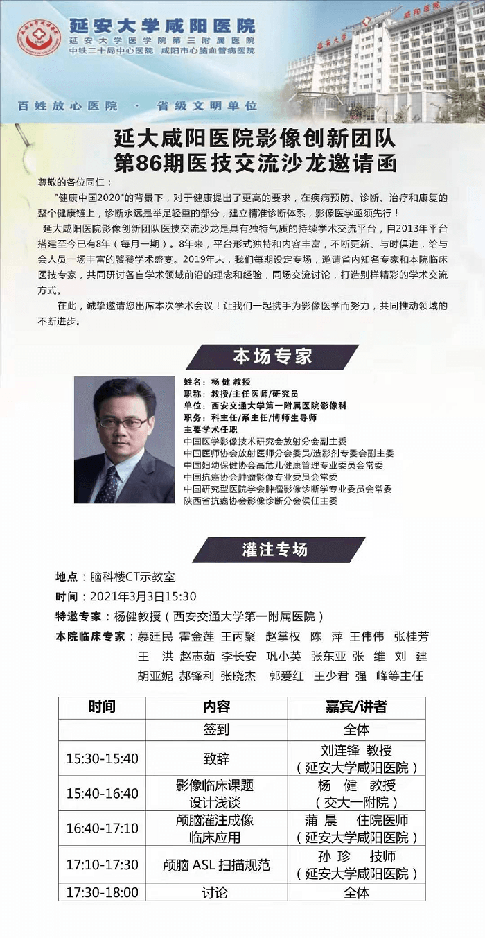 2021年3月3日,延安大學咸陽醫(yī)院第86期醫(yī)技交流活動在腦科樓CT/MRI示教室成功舉辦,延安大學咸陽醫(yī)院院長助理兼醫(yī)學影像科主任劉連鋒教授主持,特邀西安交通大學第一附屬醫(yī)院楊健教授、神經(jīng)內(nèi)科一病區(qū)王西愿責任總、神經(jīng)內(nèi)科二病區(qū)趙掌權(quán)主任、神經(jīng)內(nèi)科三病區(qū)陳萍主任、神經(jīng)內(nèi)科五病區(qū)王洪主任、神經(jīng)內(nèi)科六病區(qū)趙志茹主任、神經(jīng)內(nèi)科七病區(qū)李長安主任、神經(jīng)內(nèi)科八病區(qū)鞏曉英主任、老年病區(qū)霍金蓮主任、神經(jīng)內(nèi)科十病區(qū)張東亞主任、神經(jīng)內(nèi)科十一病區(qū)張絨責任總醫(yī)師、神經(jīng)內(nèi)科十三病區(qū)韓霞責任總醫(yī)師、神經(jīng)內(nèi)科VIP一病區(qū)王合作責任總醫(yī)師、神經(jīng)內(nèi)科VIP二病區(qū)王少君主任、中醫(yī)科強峰主任及超聲科王英莉副主任等臨床與醫(yī)技醫(yī)師參加本次活動。我院影像及臨床醫(yī)、技、護共60余人參加了本次會議。