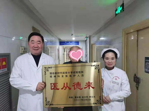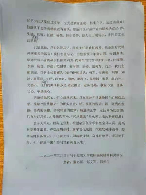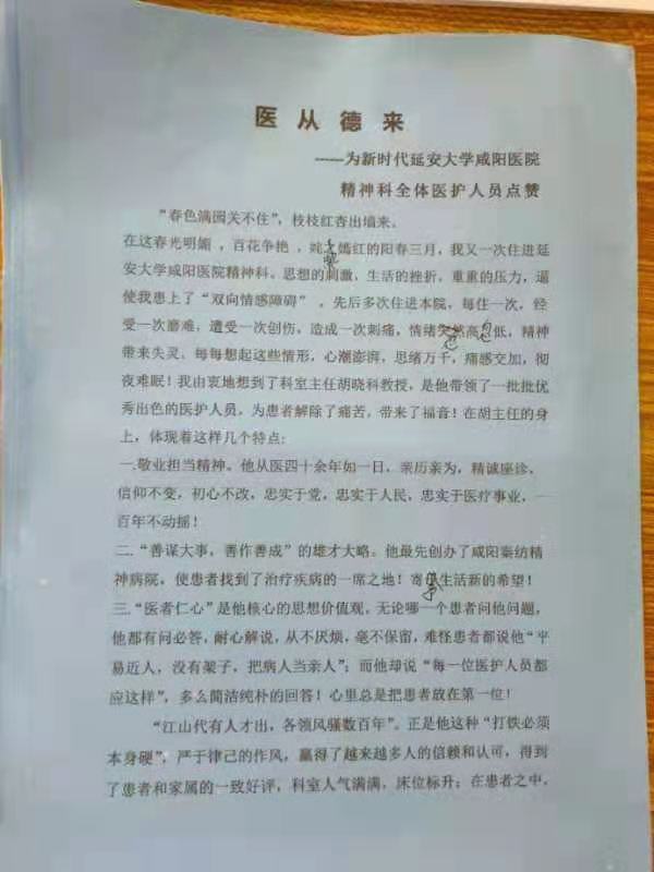 《醫(yī)從德來(lái)----為新時(shí)代延安大學(xué)咸陽(yáng)醫(yī)院精神科全體醫(yī)護(hù)人員點(diǎn)贊》這是延安大學(xué)咸陽(yáng)醫(yī)院精神科三位患者共同寫(xiě)的一份感謝信,也是精神科今年收到的一份特殊“厚禮”。