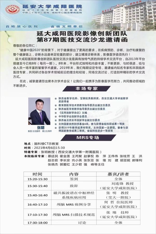 2021年4月6日,延安大學咸陽醫院第87期醫技交流活動在腦科樓CT/MRI示教室成功舉辦,延安大學咸陽醫院院長助理兼醫學影像科主任劉連鋒教授主持,特邀西安交通大學第一附屬醫院張明教授及其團隊、215醫院張華文主任團隊、咸陽市中心醫院白云主任、神經內科六病區趙志茹主任、我院老年病區霍金蓮主任、神經內科十病區張東亞主任及神經內科VIP二病區王少君主任等臨床與醫技醫師參加本次活動。我院影像及臨床醫、技、護共60余人參加了本次會議。