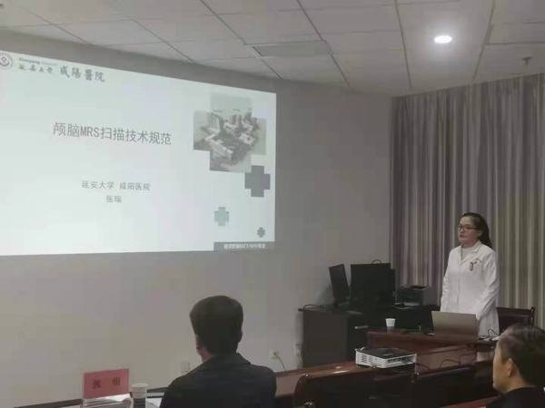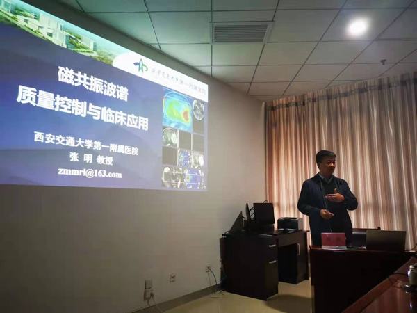 下午3點30分,會議正式開始,經過劉連鋒主任隆重介紹后,西安交通大學第一附屬醫院張明教授進行了會前致辭,張教授表示,每次來到咸陽總是懷揣著深厚的情感,看到我院及我科室不斷發展前進他感到十分的欣慰,同時對我科室工作人員給予勸勉,強調要做好病例的追蹤隨訪,不斷提高診斷水平,加強業務能力。隨后,張明對《磁共振波譜在中樞神經系統疾病應用》進行講授,從MRS臨床應用、存在問題、質量控制及質量控制的應用效果診斷思路四個方面進行了標準與規范化的指導,對于MRS常見疾病及鑒別診斷通過病例展示向大家進行了精彩詳細的講解,內容豐富,積極調動了在場聽眾的學習興趣。張教授指出,MRS掃描定位技術、序列的選擇、譜線的質量都是影像我們對疾病診斷的因素,因此建立MMRS規范化掃描流程是做好MRS質控工作的關鍵。本次授課讓與會臨床及醫技人員對磁共振波譜原理及應用有了清晰與深刻的認識,對我院MRS掃描及疾病診斷水平有顯著提高。
