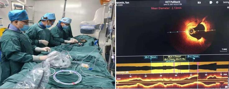 2021.6.23.16:00延安大學咸陽醫院心血管介入手術室,在吳棟梁院長指導下,心5科李陽主任教授為60歲 男性患者,在最新一代冠脈光學相干斷層檢查(Angio-OCT)的指導下進行了冠脈介入手術。這標志著咸陽市心血管內科介入精準治療再上新階段,成為繼FFR、IVUS(冠脈血管內超聲)、冠脈內旋磨等精準治療后再次首家(唯一一家)開展OCT精準治療的醫院,填補了咸陽市心血管內科專業發展的空白,為廣大冠心病患者帶來新的福音。
