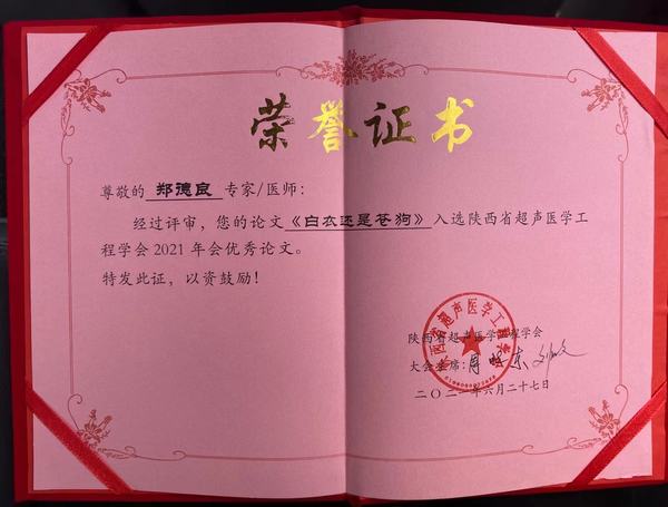 大會優秀論文匯報專場中,我院超聲醫學科心血管組鄭德良醫生的《白衣還是蒼狗》一文,在青年醫生數百篇參賽論文中脫穎而出,成功入選陜西省超聲醫學工程學會2021年會十佳優秀論文。匯報中運用杜甫的詩句“天上浮云似白衣,斯須改變如蒼狗”中的“白衣”和“蒼狗”分別指代心臟的良性病變粘液瘤與惡性病變橫紋肌肉瘤,用真實的病例和生動的演講為大家展示了這兩者的鑒別與診斷,其突出的匯報方式受到點評專家、教授及參會者高度贊譽。