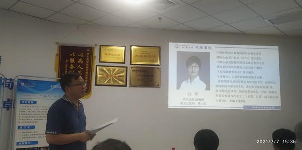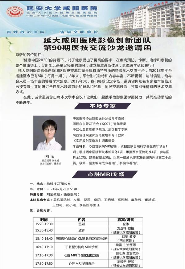2021年7月7日,延安大學咸陽醫院第90期醫技交流活動在腦科樓CT/MRI示教室成功舉辦,會議由延安大學咸陽醫院院長助理兼醫學影像科主任劉連鋒教授主持,特邀西京醫院劉瑩副教授前來授課指導,我院急診科宋治國主任、心內3科蔡萍主任、心內5科李陽主任及心胸外科武小剛主任等臨床專家參加本次活動,我院影像及臨床醫、技、護共40余人參加了本次會議。