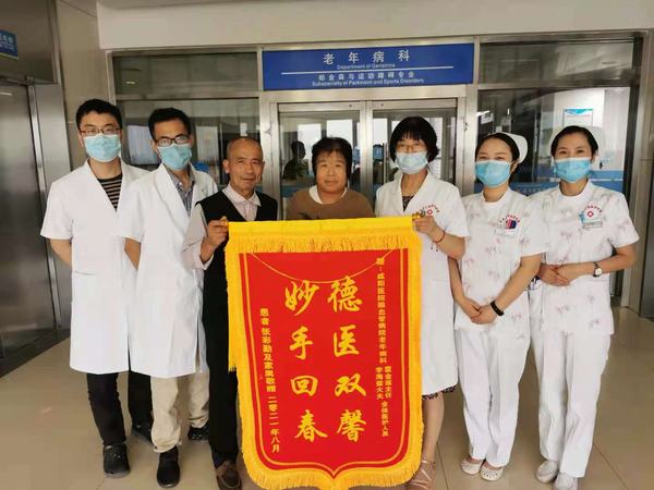 時隔半小時,又傳來一陣緩慢的拐杖聲。張阿姨和她的老伴申叔叔今天出院,特意做了面錦旗,送給主任和李海榮醫(yī)生。感謝大家在他們住院期間,醫(yī)護人員給予的治療與護理,對治療效果非常滿意。護理人員給予的照護,讓他們感受到不是親人,卻勝似親人般的關(guān)懷。