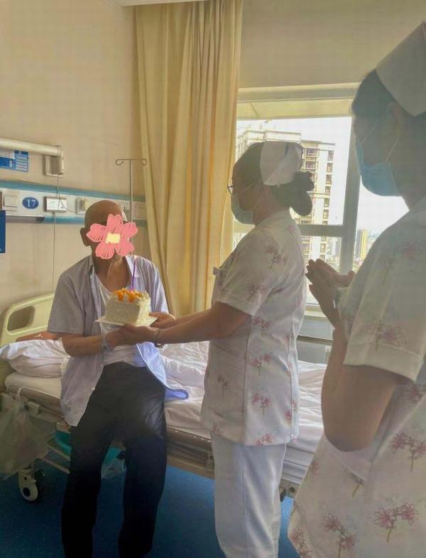 原來,護士在與家屬交談過程中得知患者恰巧今天生日,隨即與病區王小俠護士長聯系,核實了病人生日信息后,精心為病人準備了精美的蛋糕。當醫護人員帶著生日蛋糕出現在陳爺爺的面前時,他對這意外的驚喜感動得熱淚盈眶,臉上露出了開心的笑容。小小的病房,大大的關愛。在蛋糕、歌聲的圍繞下,陳爺爺眼中閃爍著幸福的淚光。看到此情此景,家屬感動地說:“謝謝你們,你們想得太周到了,你們的關愛與照護讓我們很感動”。
