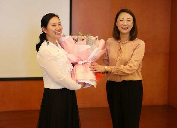 區(qū)委常委、組織部部長李婉妮同志向廉秋芳教授送上鮮花及慰問金