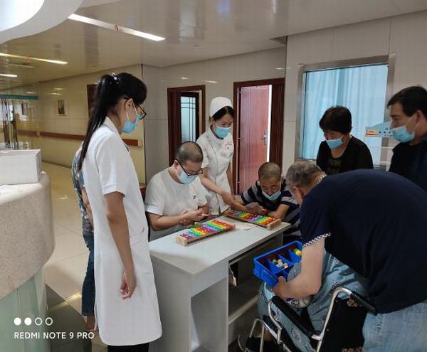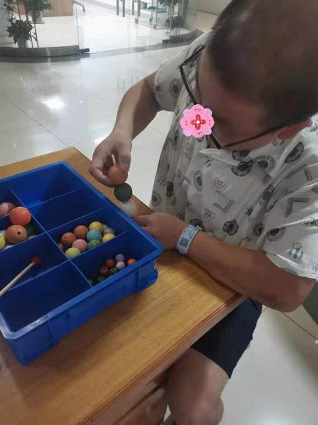 每日16:00-20:00安排一名護士專人負責組織,以手部精細動作訓練為主,可以敲擊小琴、串珠子、分珠子、擰螺絲等活動來訓練患者,并教會患者一些日常生活技巧,如穿脫衣褲、穿脫鞋襪、洗手、洗臉、梳頭、進食等。活動期間醫護人員陪同在旁,觀察患者的康復鍛煉,給予適宜的幫助指導,并保護患者的安全,以達到早日回歸家庭、回歸社會的目的。