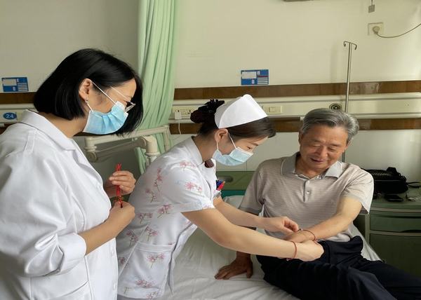 “每逢佳節倍思親!”為了讓患者在醫院感受到家的溫暖,隨后,醫護人員又給每一位患者系上祈福納吉的“五彩繩”。一聲聲“端午安康”,傳遞著溫馨的“醫患情”!禮物雖小,卻代表了我們科室全體醫護人員的一份心意,更體現了醫院對患者無微不至的人文關懷與優質的服務內涵。希望他們在延安大學咸陽醫院度過一個安康、開心的端午節,同時祝福他們早日康復。