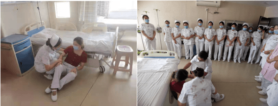 演練開始,責任護士楊娟花巡視病房時發現一名患者從床上起身時突發頭暈滑落床邊,在安撫好病人的同時立即通知值班護士張永梅呼叫主管醫生宋張鵬和患者家屬,主管醫生宋張鵬迅速到場判斷患者情況,協助楊娟花護士將患者扶到病床上休息,進行查體,護士張永梅測量患生命體征,在確認患者無礙后,囑其臥床休息,臨床觀察,責任護士安撫家屬和患者,并再次進行健康宣教。