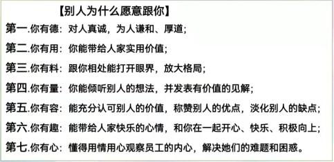 通過【別人為什么愿意跟隨你】讓我們知道作為一名管理者,應該做到“有德、有用、有料、有量、有容、有趣、有心”。