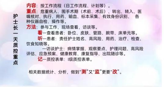 心七科通過護士長一天的質控重點,讓護士長的工作更加有序,用看、聽、記等方法掌握了患者的情況、護士的工作、科室的質控情況,做到了“測、監、改”。